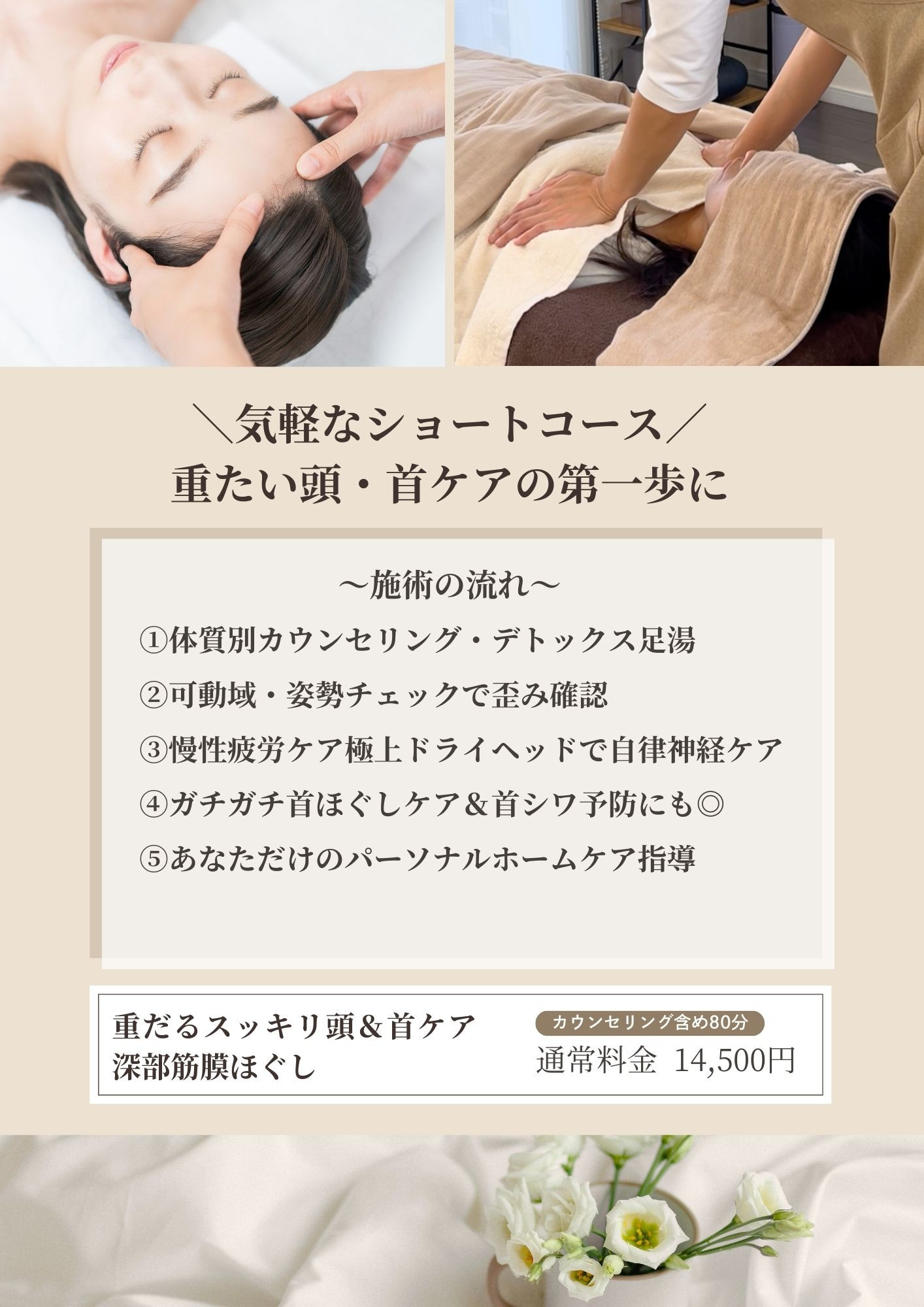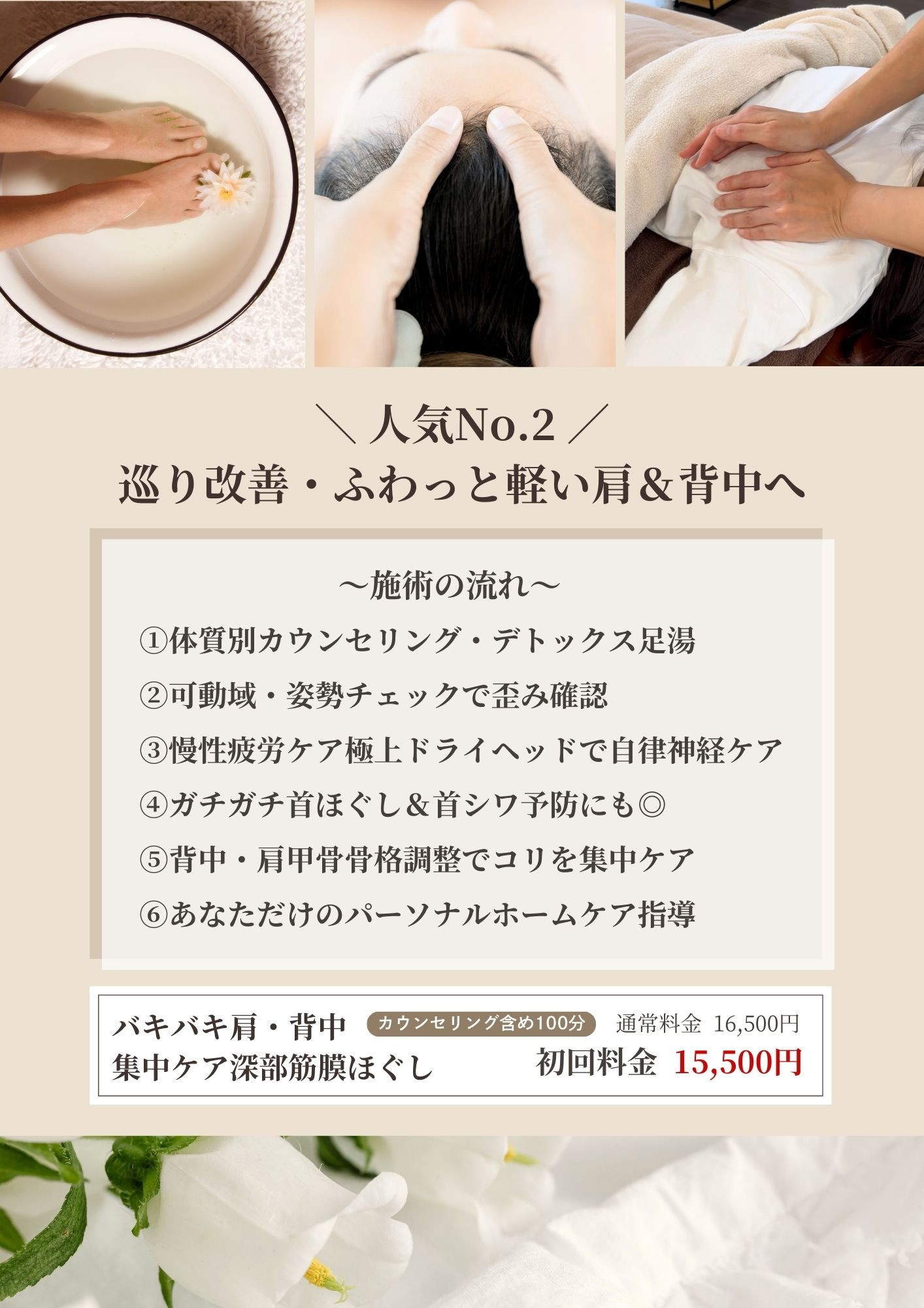 ズーンと芯に響くようなタッチで、血流の改善と自律神経の調整を図り、深いリラクゼーションへと導きます。